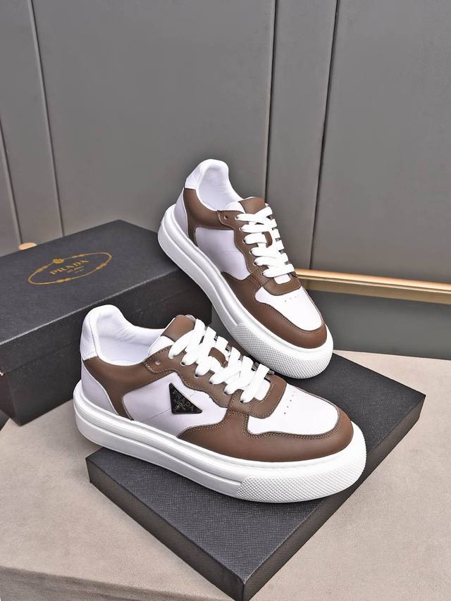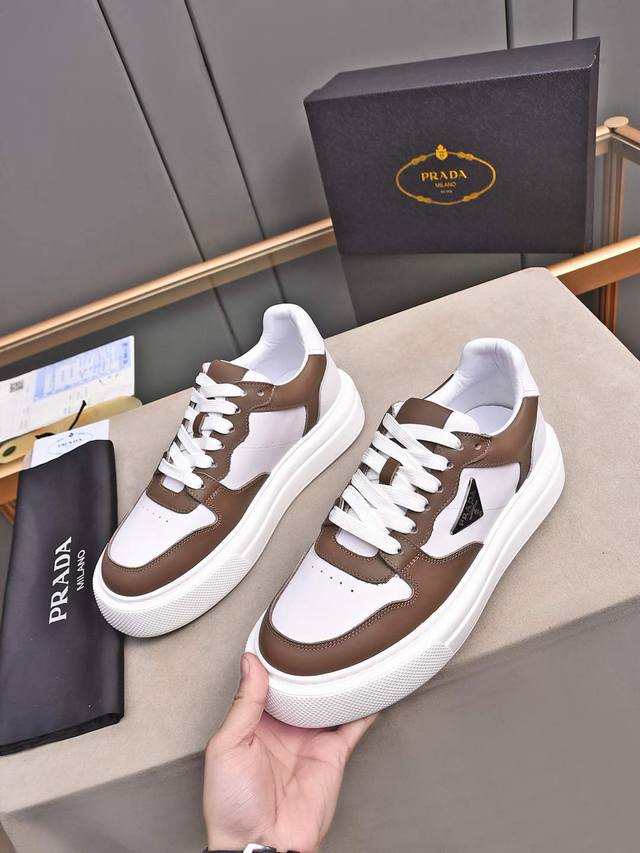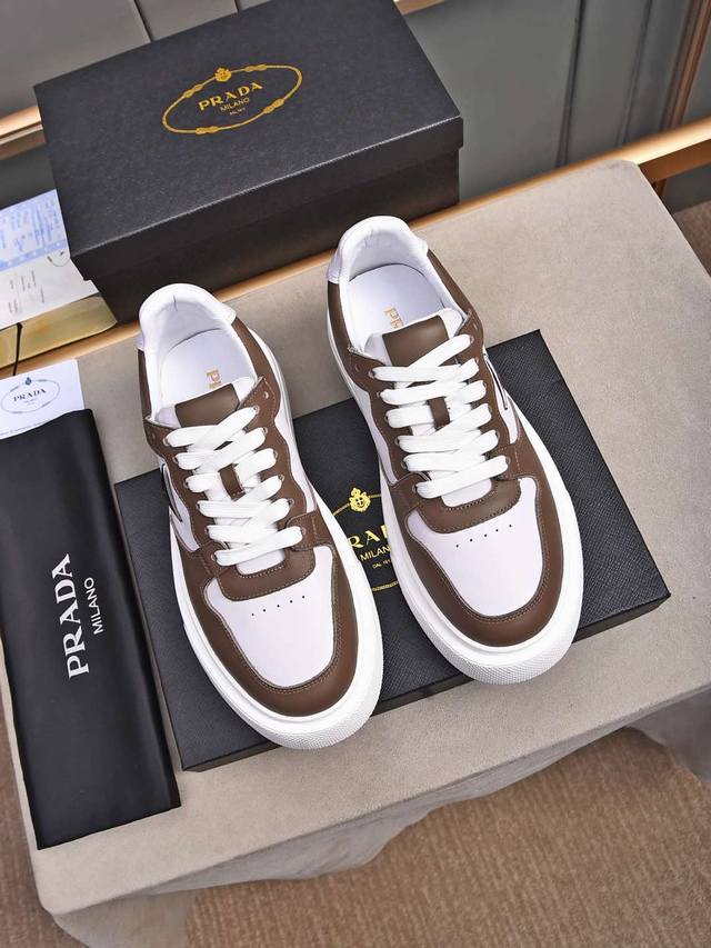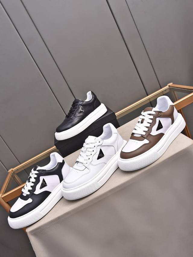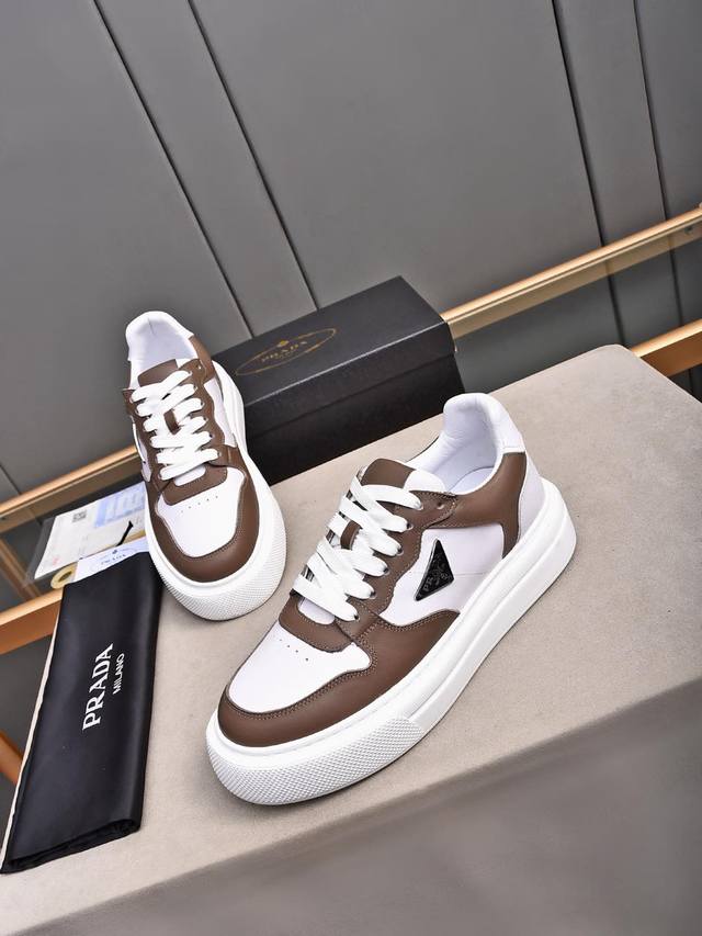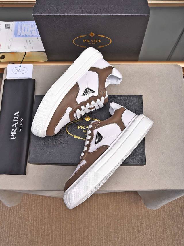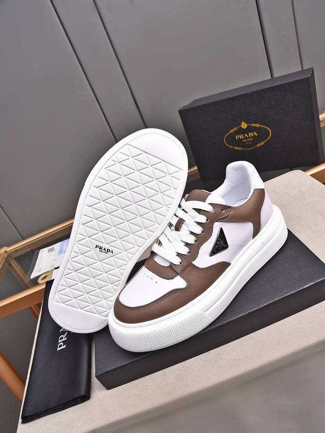 / Prada 普拉达 男士新款休闲鞋,这款鞋面采用进口小牛皮 外侧饰以p家经典金属三角珐琅徽标,牛里,垫脚牛皮,大底采用防滑运动专属带logo橡胶大底,上脚脚感很