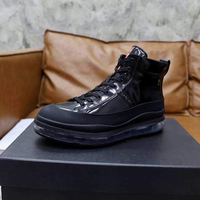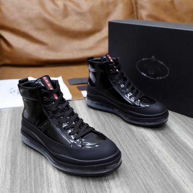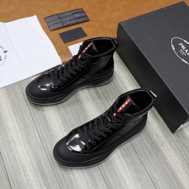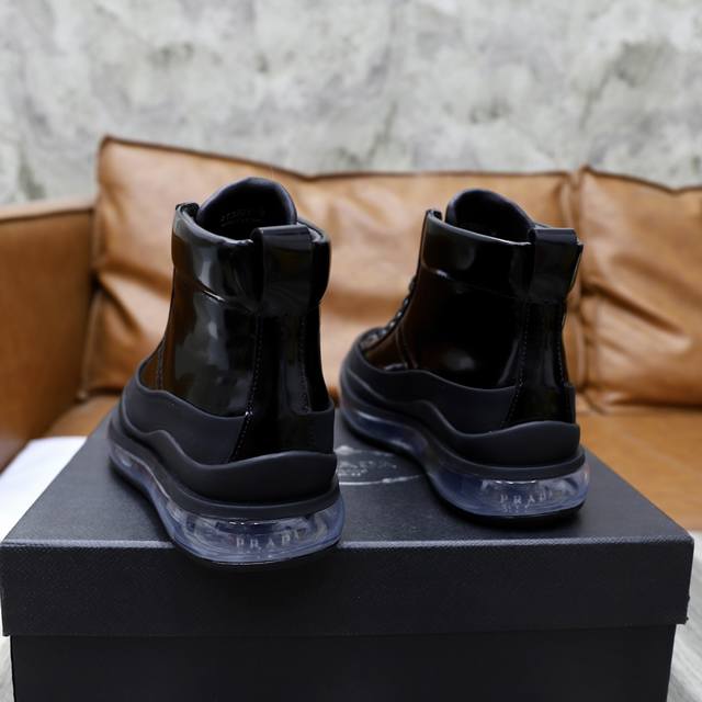 莞产顶级猛货 秀场版 领先专柜尝鲜款式 纳帕牛皮材质 轻盈透气 柔软舒适 侧面拉链开合穿脱更方便 小牛皮真皮包边装饰 颇具与众不同的运动风范 真皮鞋舌 PRADA字母徽章 尽显品牌格调 轻质凹凸花纹气垫鞋底 轻盈且增高约4CM 真皮垫脚 全羊毛充斥内里脚感极佳 配原包装