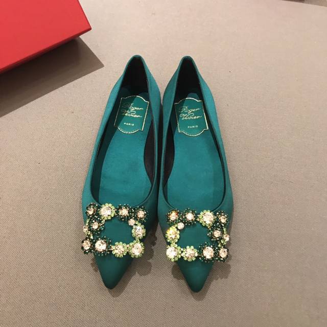平底 代购级别 出厂价格: 元 Roger Vivier 花扣 100%纯真丝! 意大利真皮大底、施华洛世奇钻扣! 专柜色黑色白钻、黑色彩钻、酒红色、雾霾蓝、香