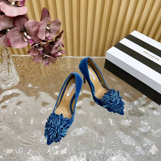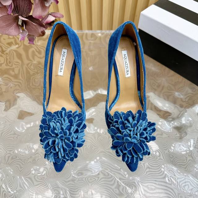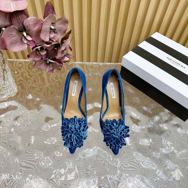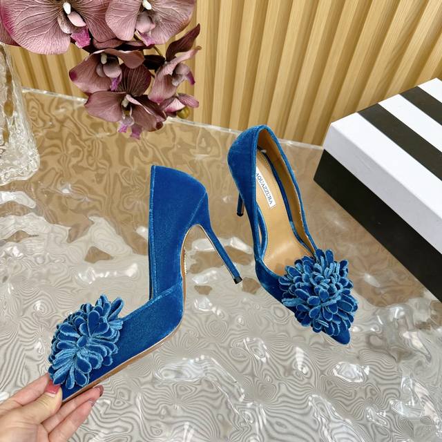 aquazzura 2024 新款顶级版本 菠萝女士丝绒 高跟凉鞋原版1比1开模鞋跟 丝绒花球点缀 高跟闪耀光芒