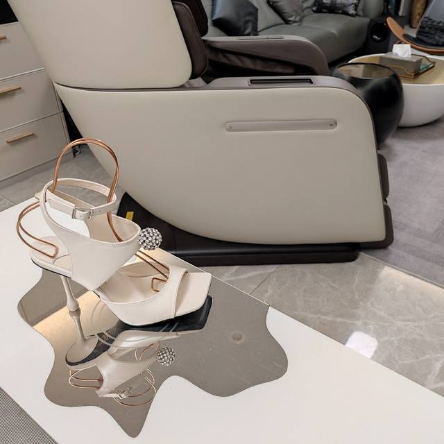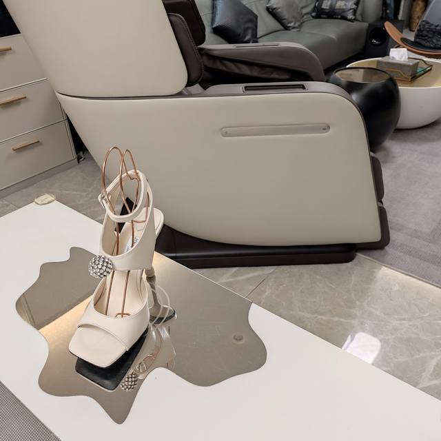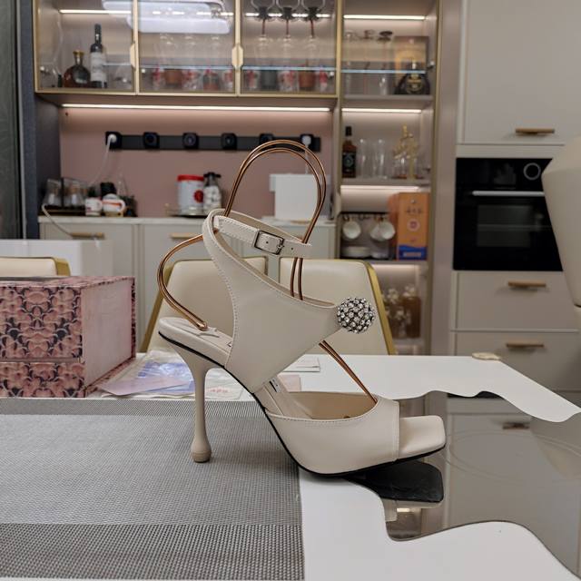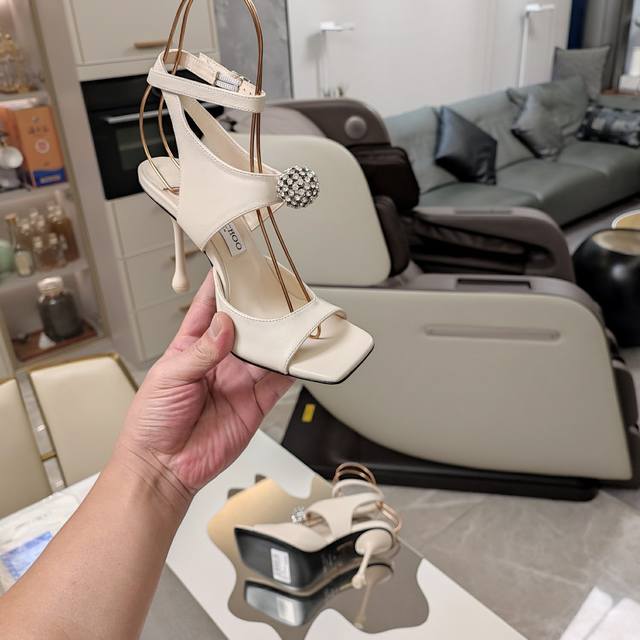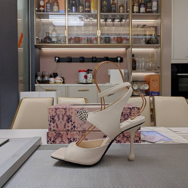 摩登鞋履,今年吉米周最流行的水滴跟系列来袭,水滴形细高跟,方头鞋面,个性点水晶钻球于鞋面,时尚自带简约后包裹带凉鞋。