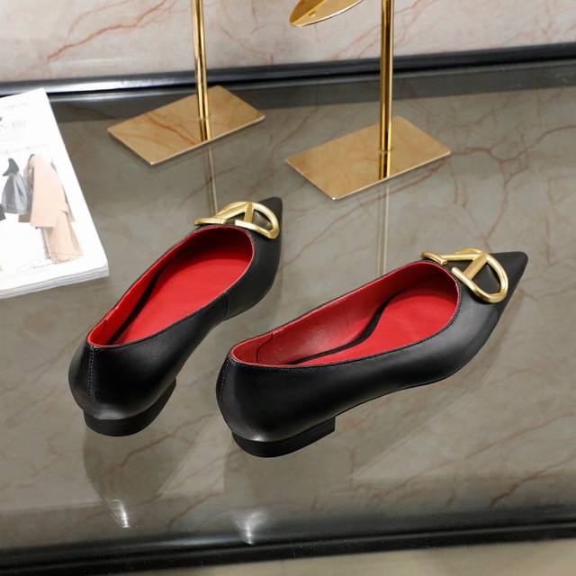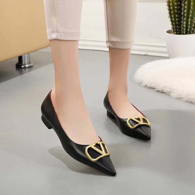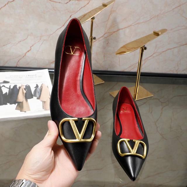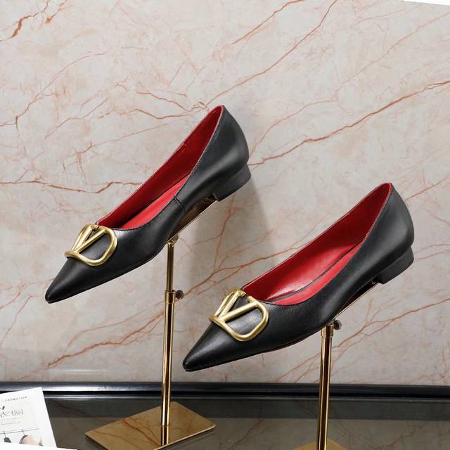 冲量价: 华伦天奴平跟单鞋,大v字母扣.实拍图,码数35-40,平跟高1.5厘米,粒面软牛皮,内羊皮,,橡胶底,黑色,米白色,红色,粉色,共4色