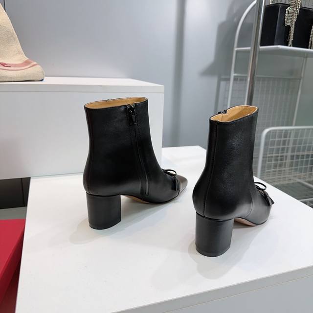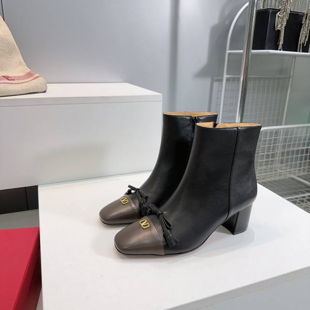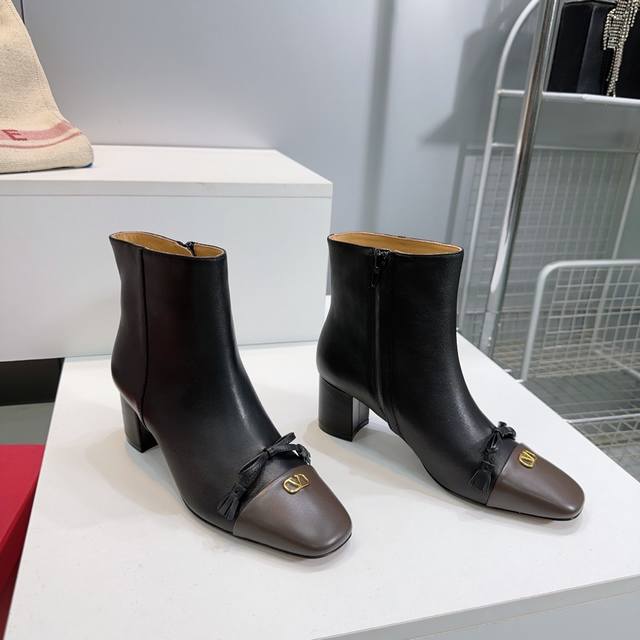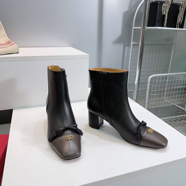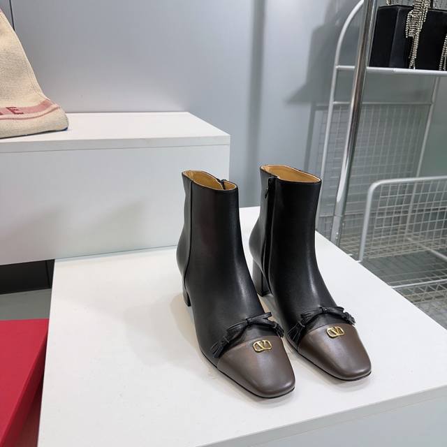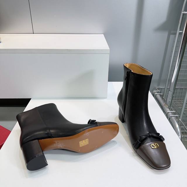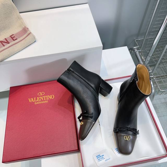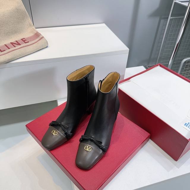 高品质出厂 !顶级品质Valentino华伦天奴2025秋冬专柜最新蝴蝶结粗跟粗跟侧拉链小方头时装短鞋!经典小V扣配上优雅可爱撞色蝴蝶结!