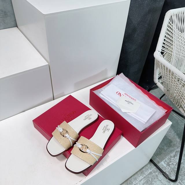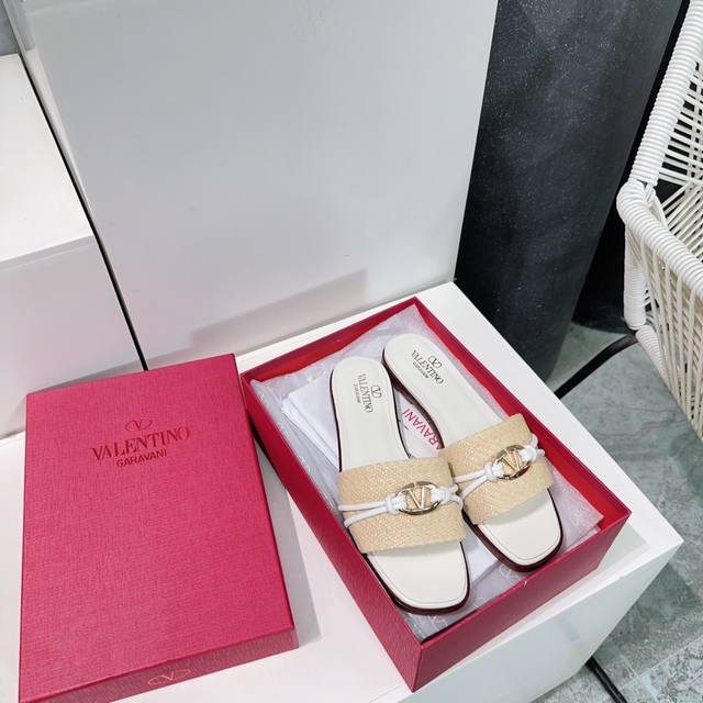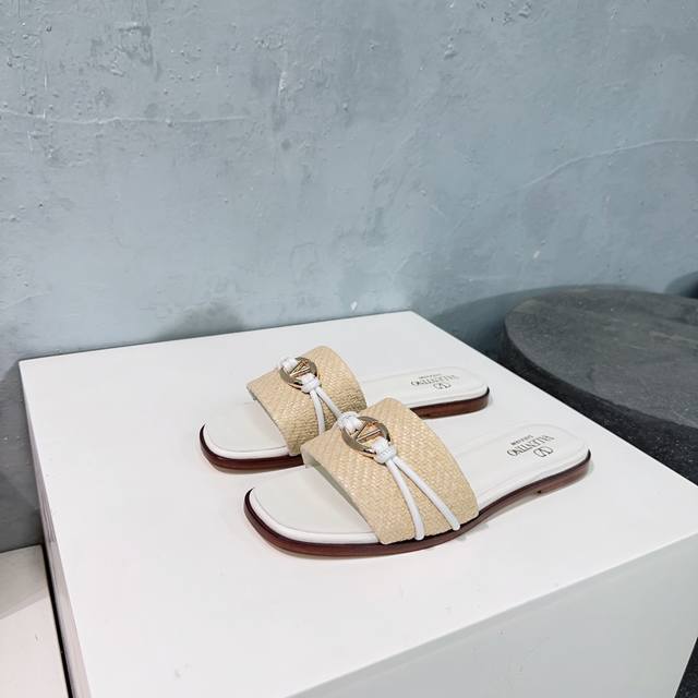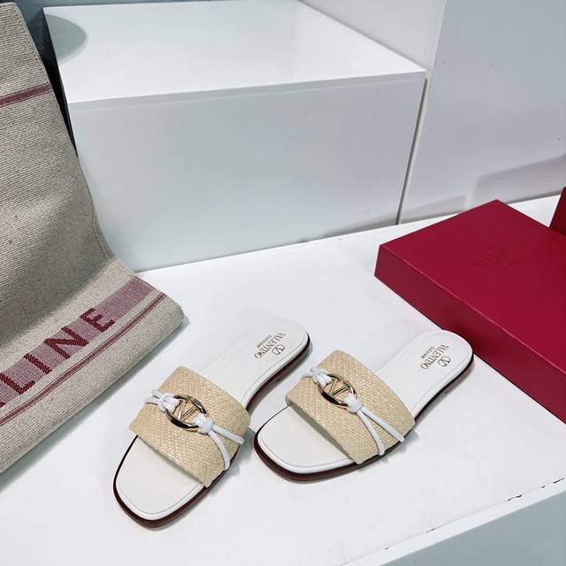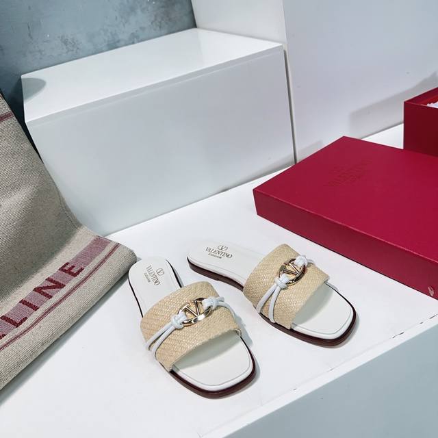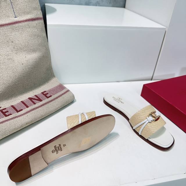 高品质出厂 !顶级品质valentino华伦天奴25春夏新款草编鞋面v扣配饰平底拖鞋!独家新出!鞋面草编工艺复杂且环保垫脚头层混种羊皮通铺,不卡脚,意大利进口加厚真皮鞋底耐磨防滑,一字拖款式,明星同款旅游居家穿着方便。