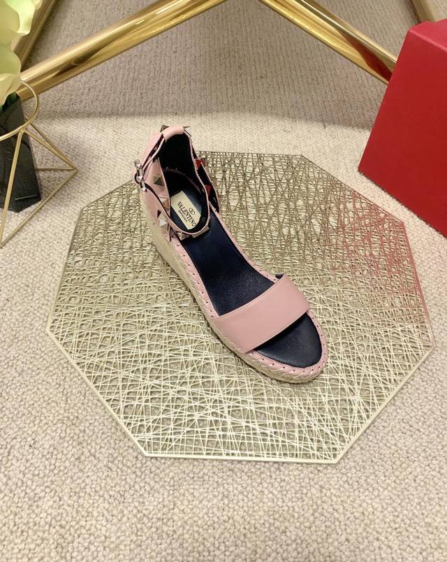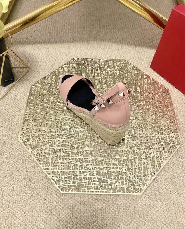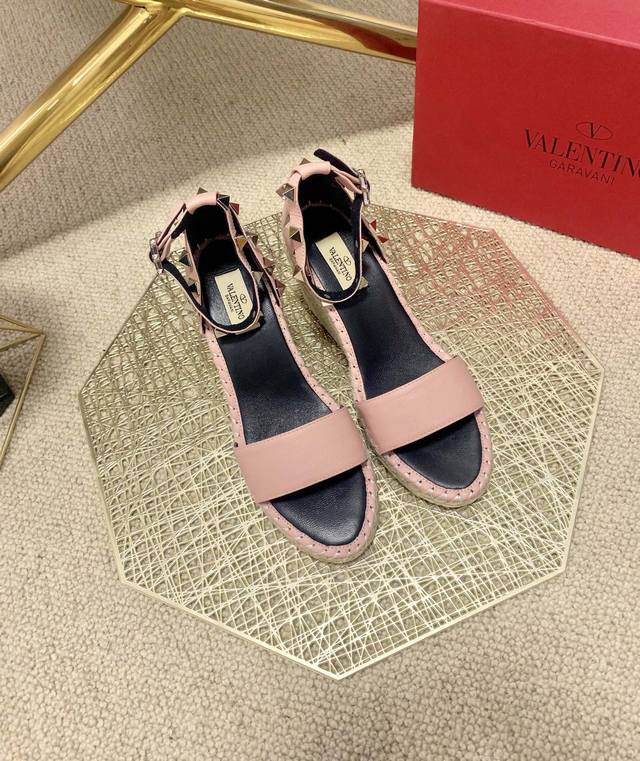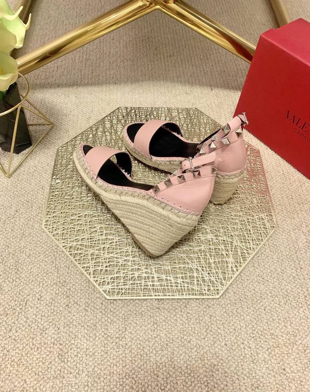 / Valentino Garavani 荔枝牛皮系带坡跟凉鞋 - 金属效果工艺处理铆钉装饰 - 麻绳包裹坡跟 - 可调节小牛皮系带 - 坡跟防水台 - 意大利制造