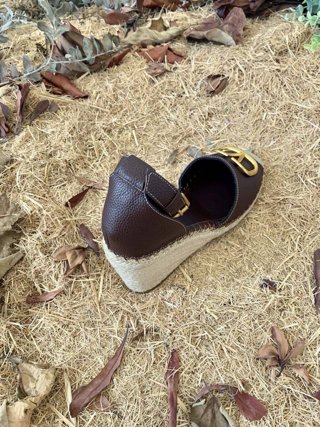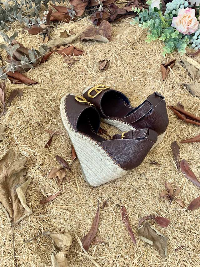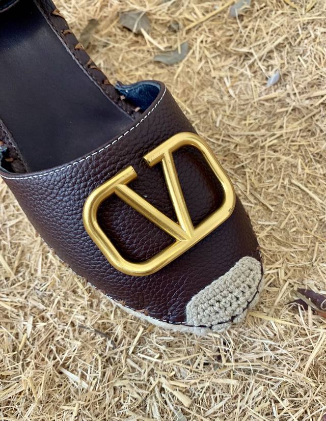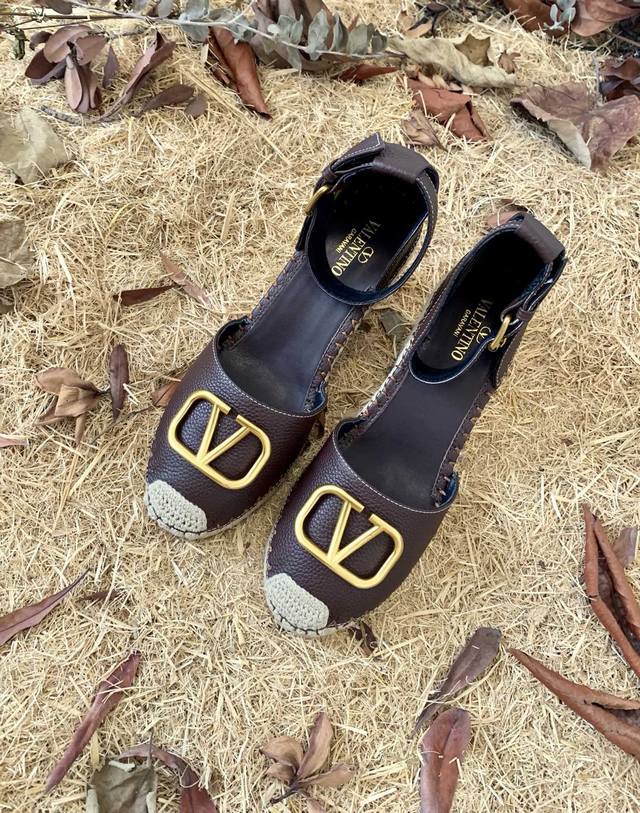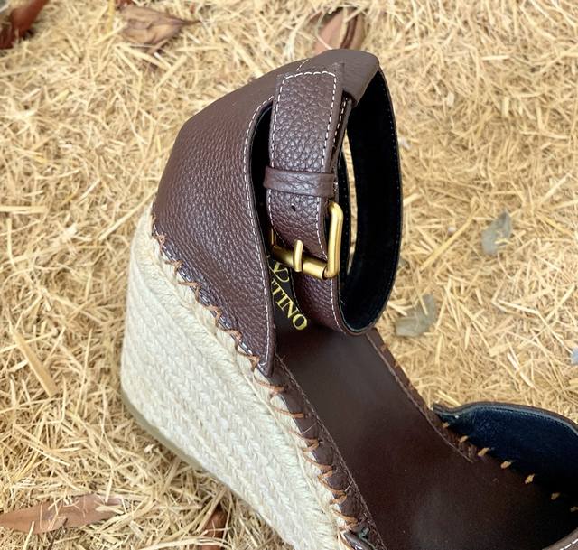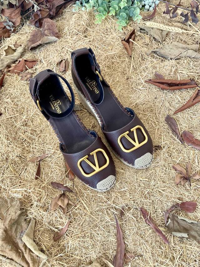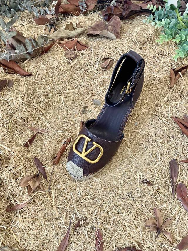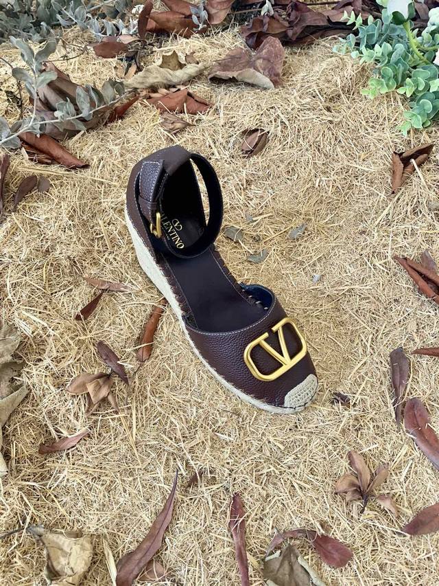 / Valentino Garavani 荔枝牛皮系带坡跟密头凉鞋 - 大V金扣装饰 - 麻绳包裹坡跟 - 可调节小牛皮系带 - 坡跟防水台 - 意大利制造 -35