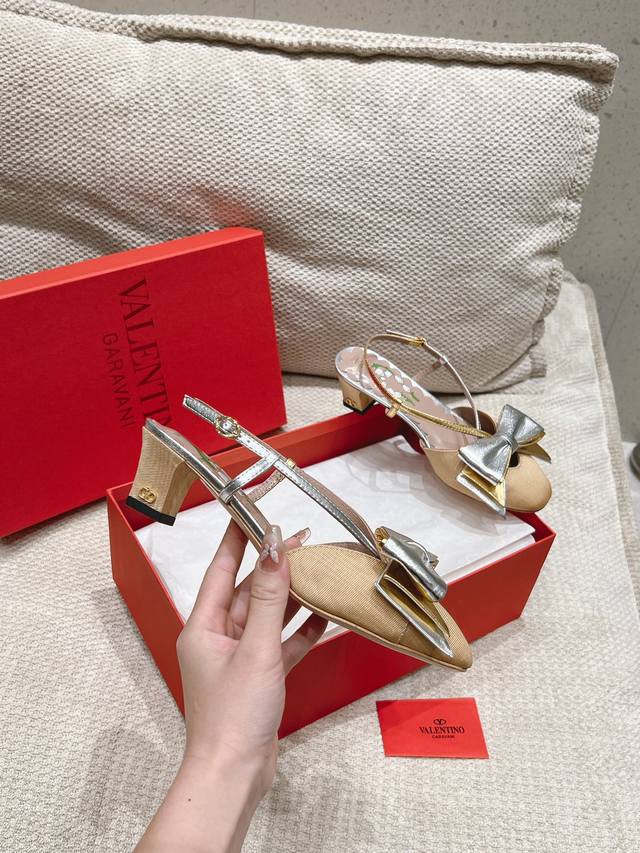 华伦天奴2025早春新款Valentino 华伦天奴春夏新品蝴蝶结设计Valentino Garavani Bowow 提花织物后系带高跟鞋,配以双色金属质感羊