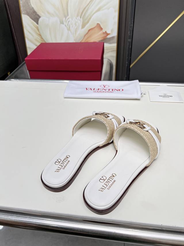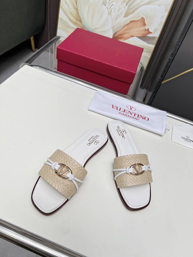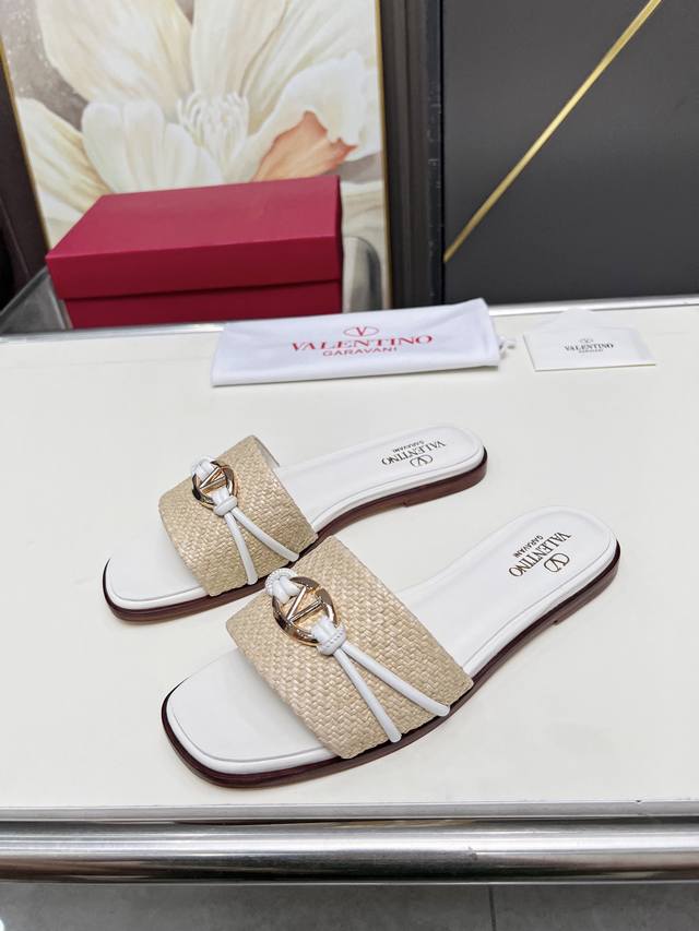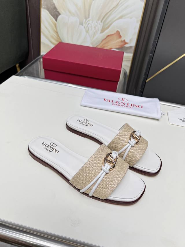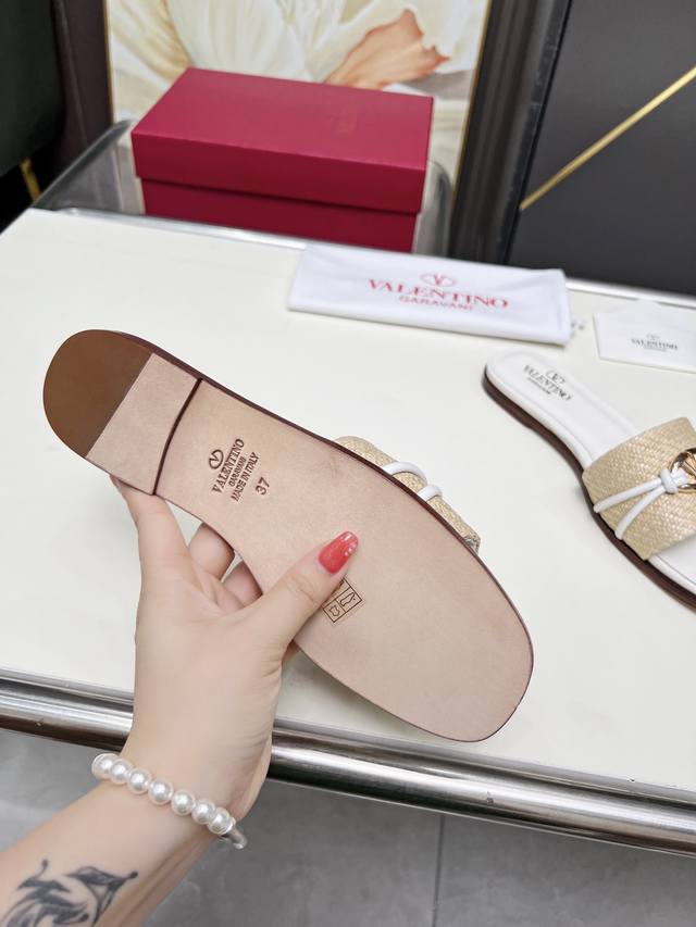 顶级版本Valentino初秋新款,独家新出,鞋面草编工艺复杂且环保垫脚头层混种羊皮通铺,不卡脚,意大利真皮鞋底耐磨防滑,一字拖款式,明星同款旅游居家穿着方便。