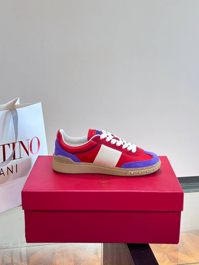 / Valentin*华伦天奴情侣款休闲板鞋,时尚百搭单品,小牛皮+麂皮反绒重工打造 橡胶鞋底装饰 Vlogo Signature 和铆钉细节 头层牛皮内里,上脚舒