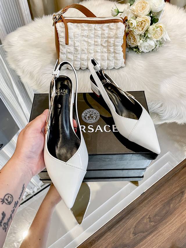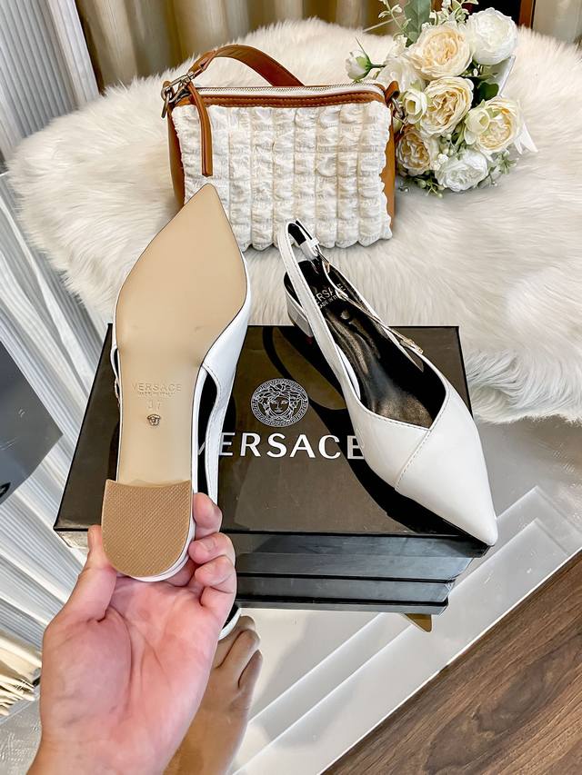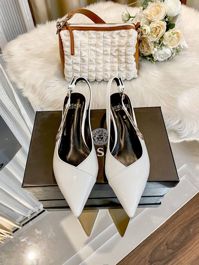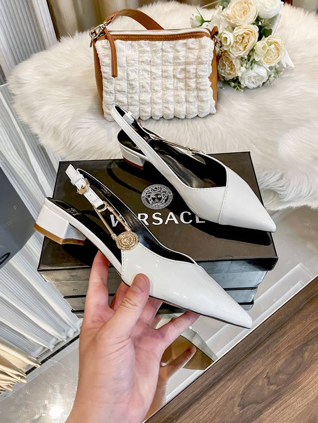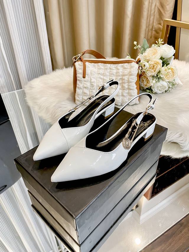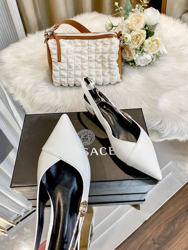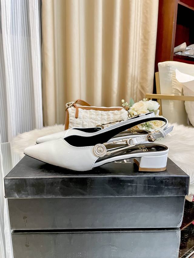 / 出厂: Versace 范思哲新款 美杜莎别针扣小粗跟后空凉鞋 鞋头尖头设计美杜莎女王专属logo纤巧利落的造型,衬显双脚更加秀美、骨感,同时又散发着浓郁时尚气