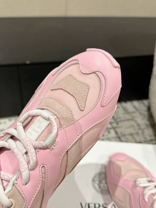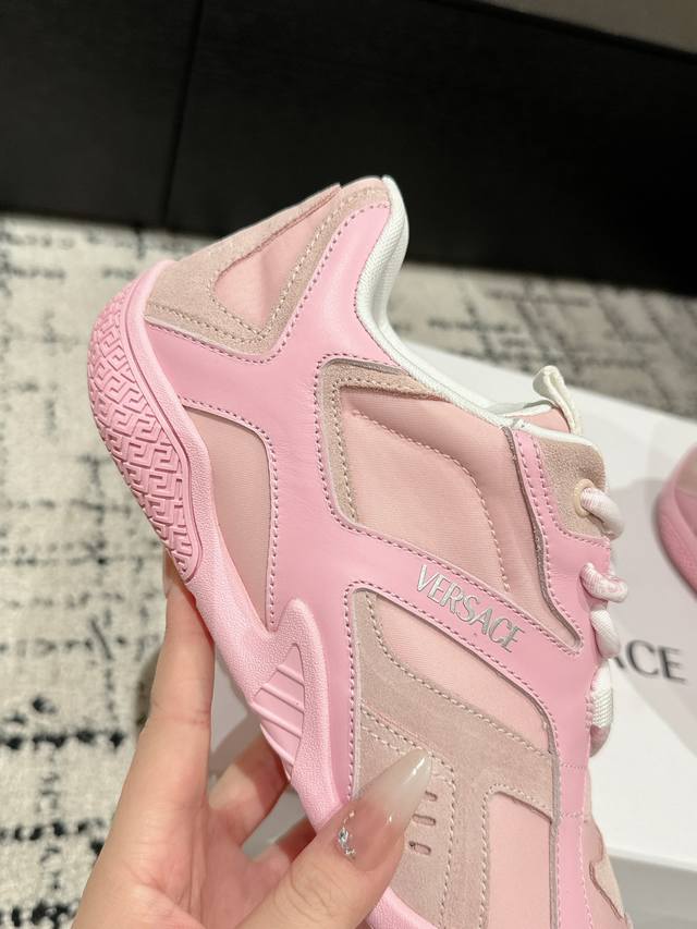赵露思同款圆头低帮系带创新运动鞋 融合拳击鞋的敏捷性和跑鞋的力量感 轻薄、多功能橡胶大底饰有循环出现的greca图案 光滑的鞋楦确保穿着舒适 而牛皮革和科技面料的混搭则彰显灵活性和结构感 上脚舒适轻盈 轻松搭配 四季都能穿~
