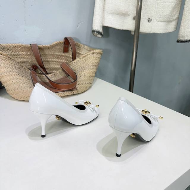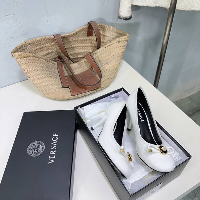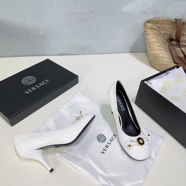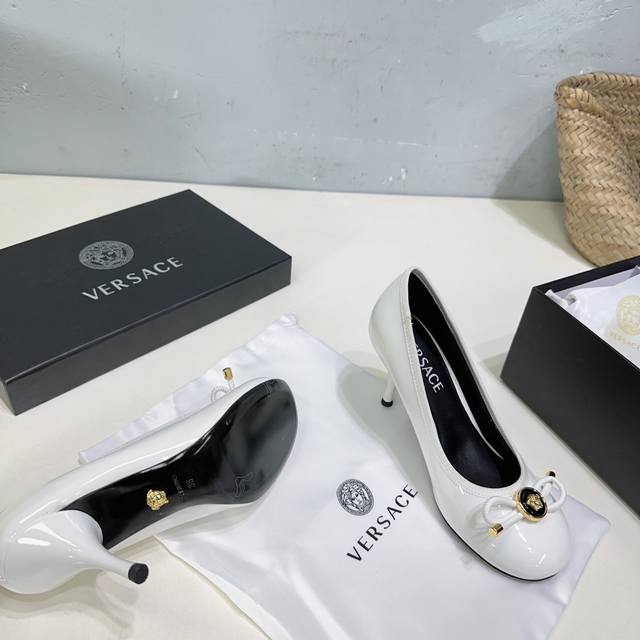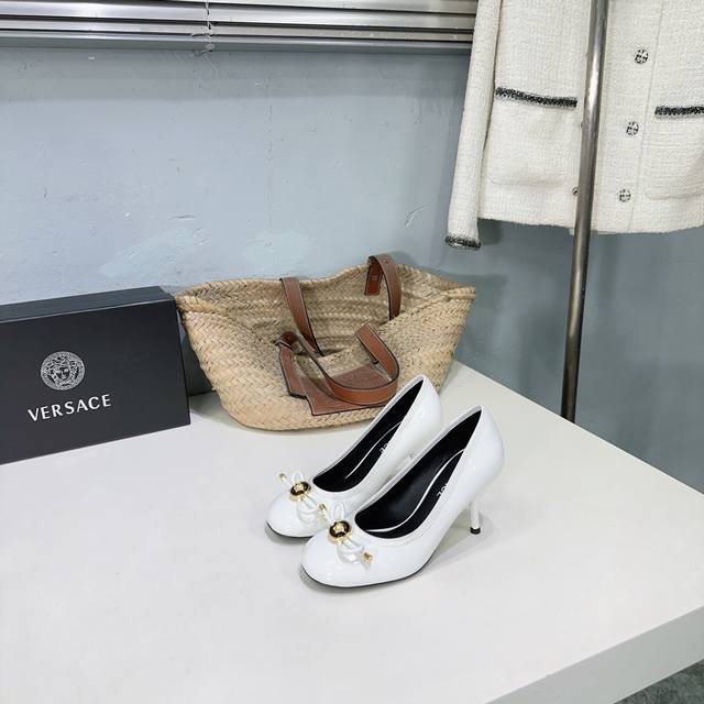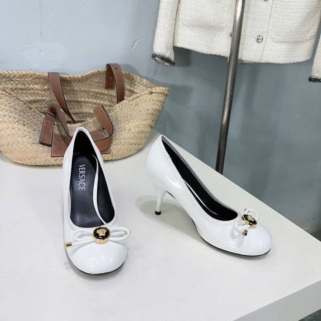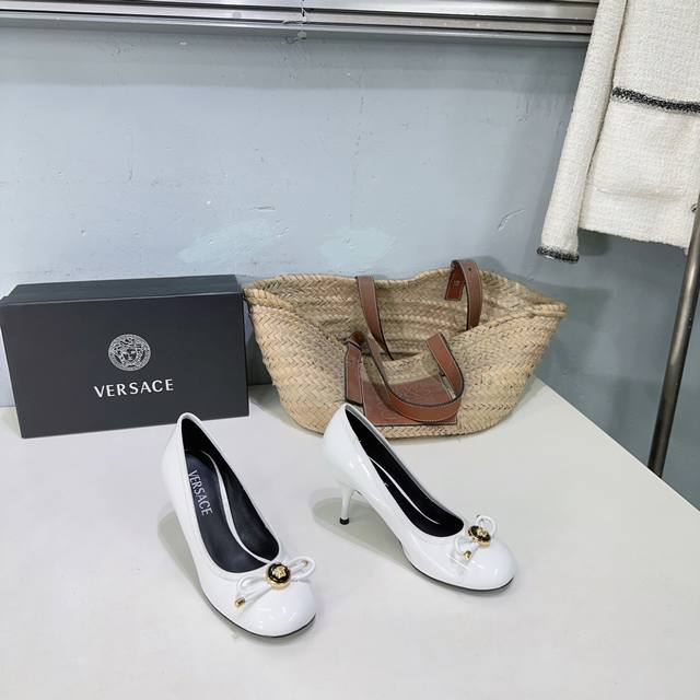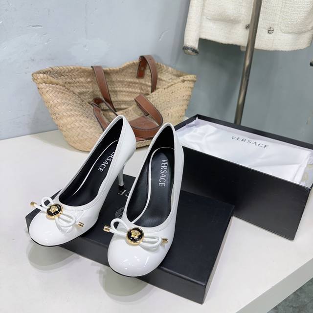 高品质出厂 !小众潮牌Versace 范思哲2025春夏新款蝴蝶结圆头玛丽珍高跟单鞋