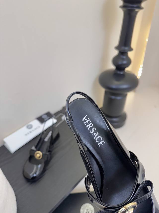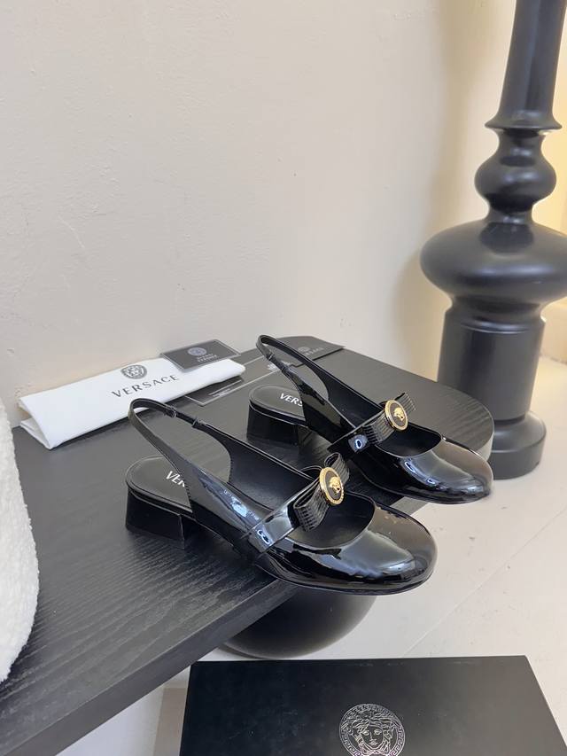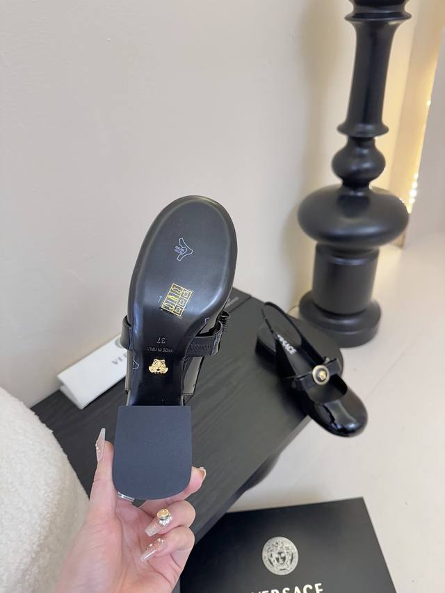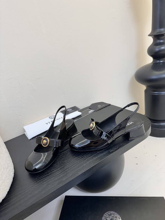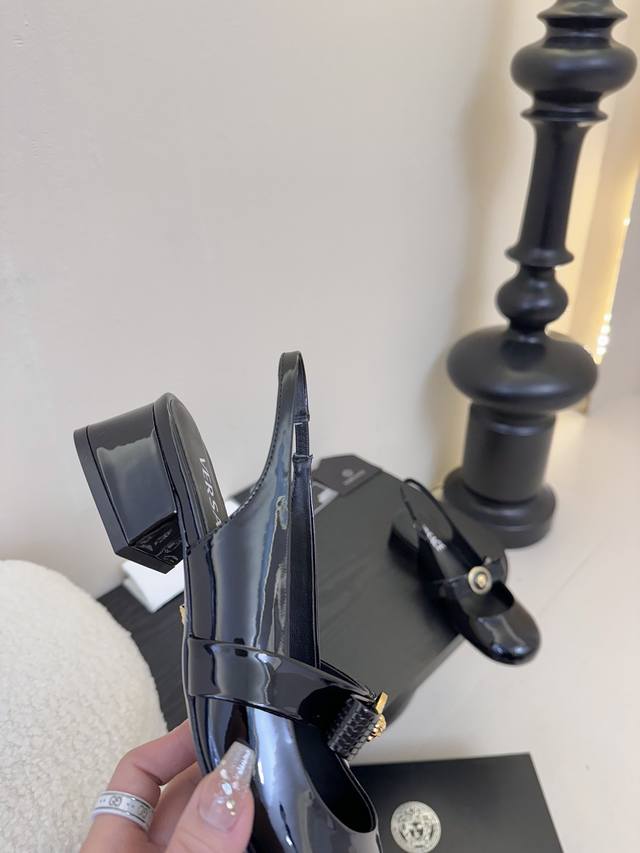 360 versace 范思哲2025春夏新款蝴蝶结 粗跟圆头玛丽珍后空凉鞋! 米兰秀场同简约干练的版型 鞋面采用软漆皮 内里垫脚进口羊皮 意大利进口原色真皮大