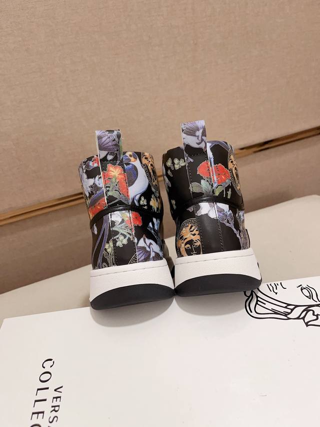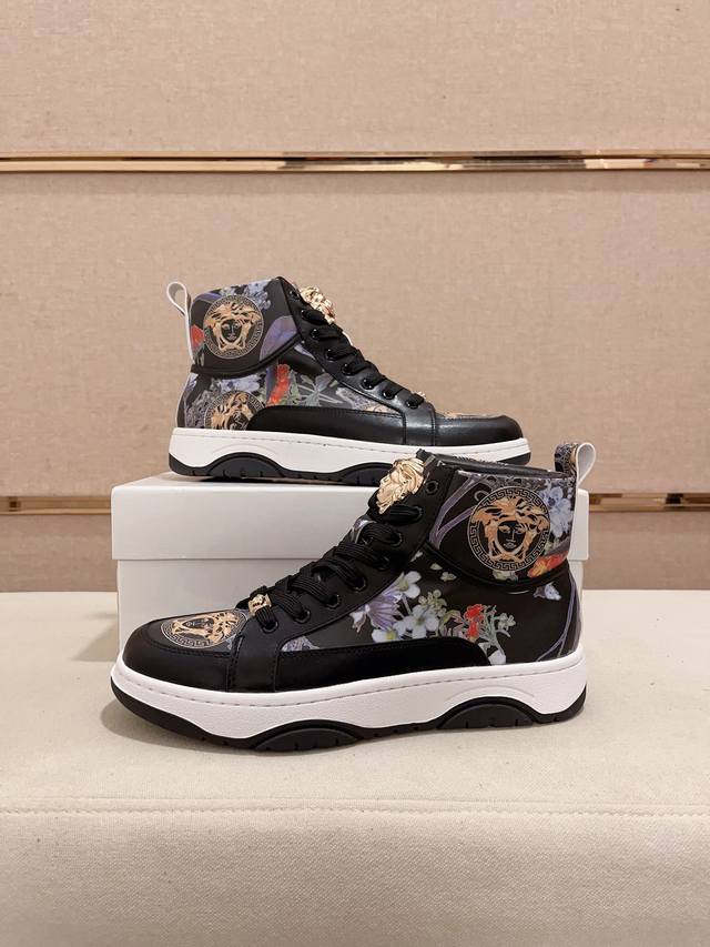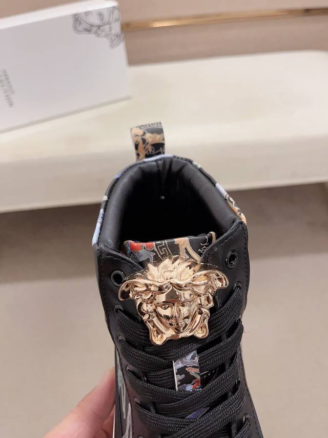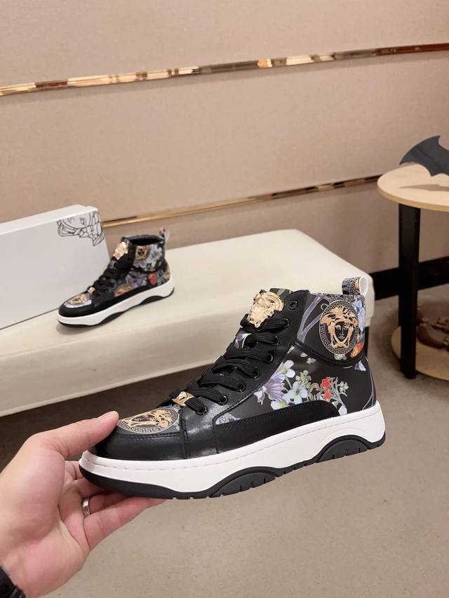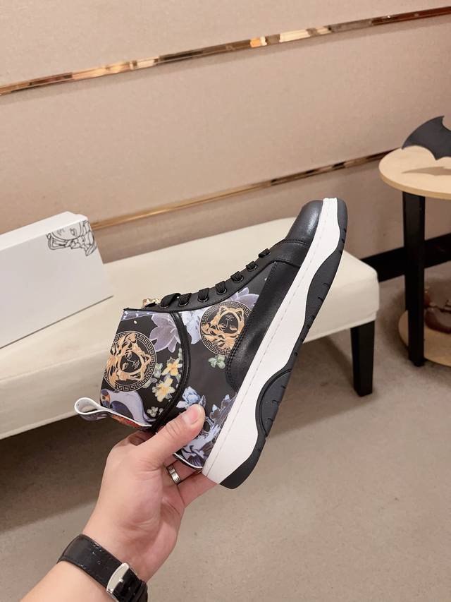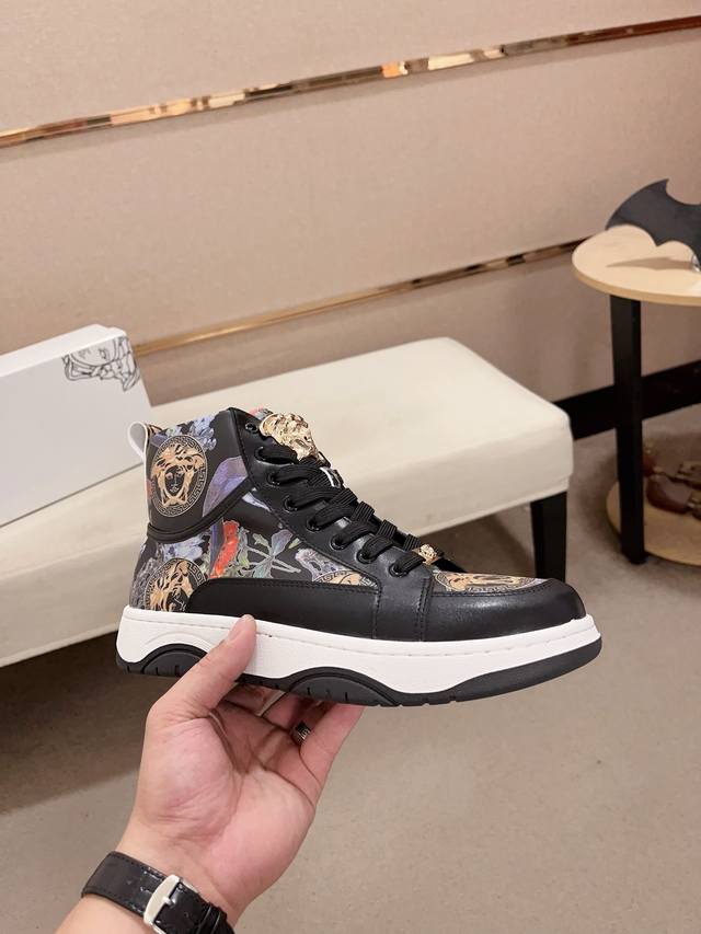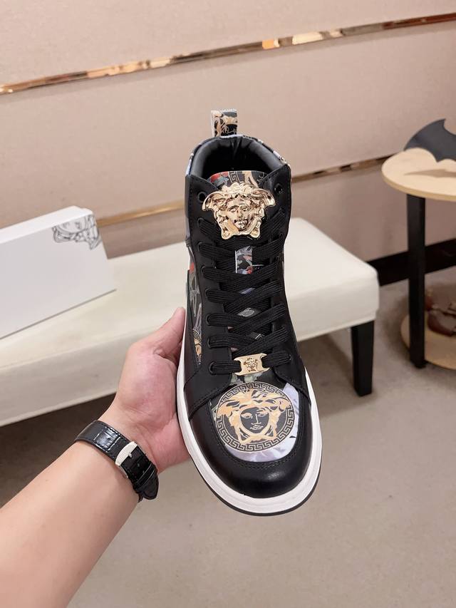 工厂价: Versace 范思哲 新款高帮休闲运动风男鞋,全新春夏季款设计,完美做工,系带懒人款打造装柜品质,鞋面:进口牛皮,羊皮内里柔软舒适,超轻TPU耐磨大