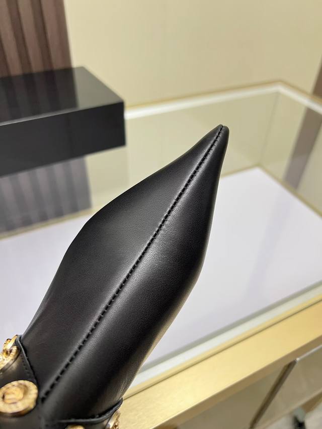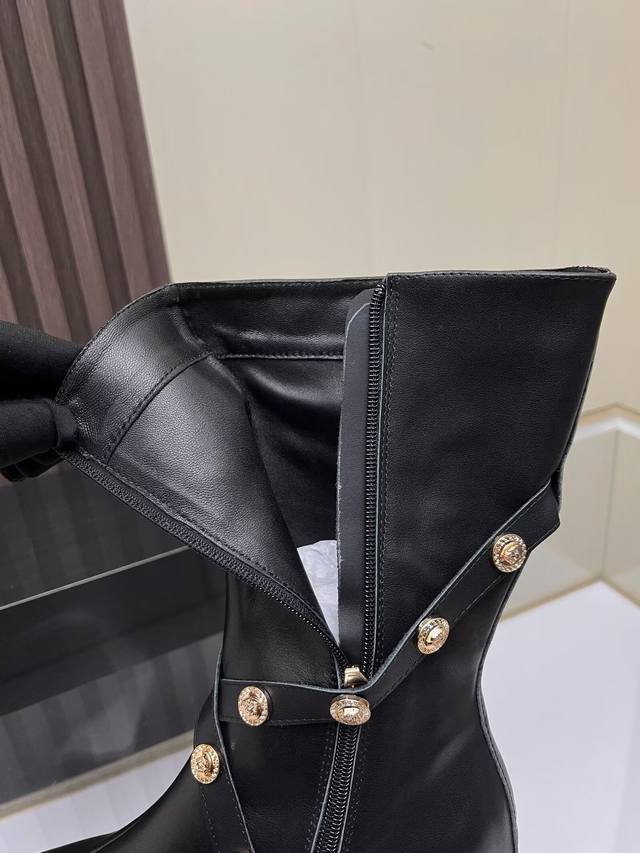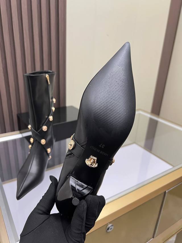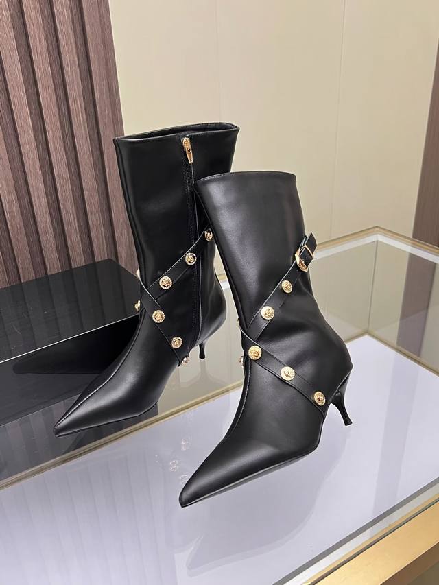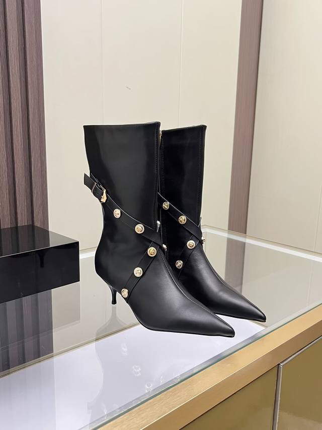 范思哲时尚低跟短靴,面料牛皮,内里垫脚全羊皮,橡胶大底,跟高6Cm。