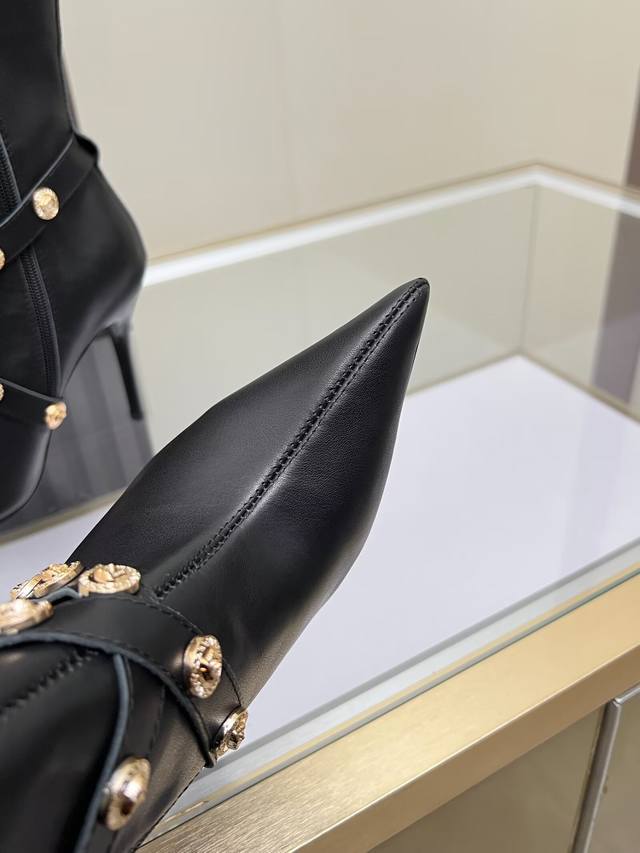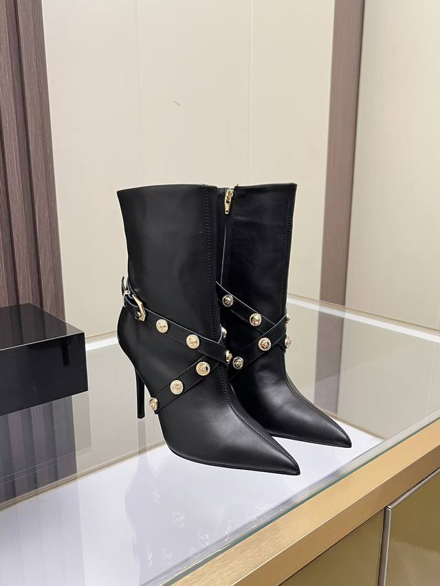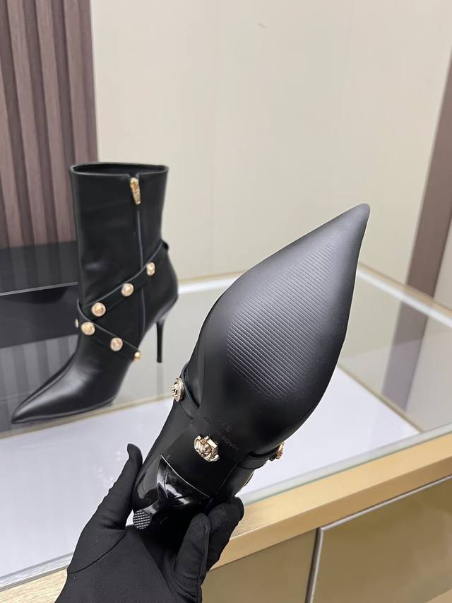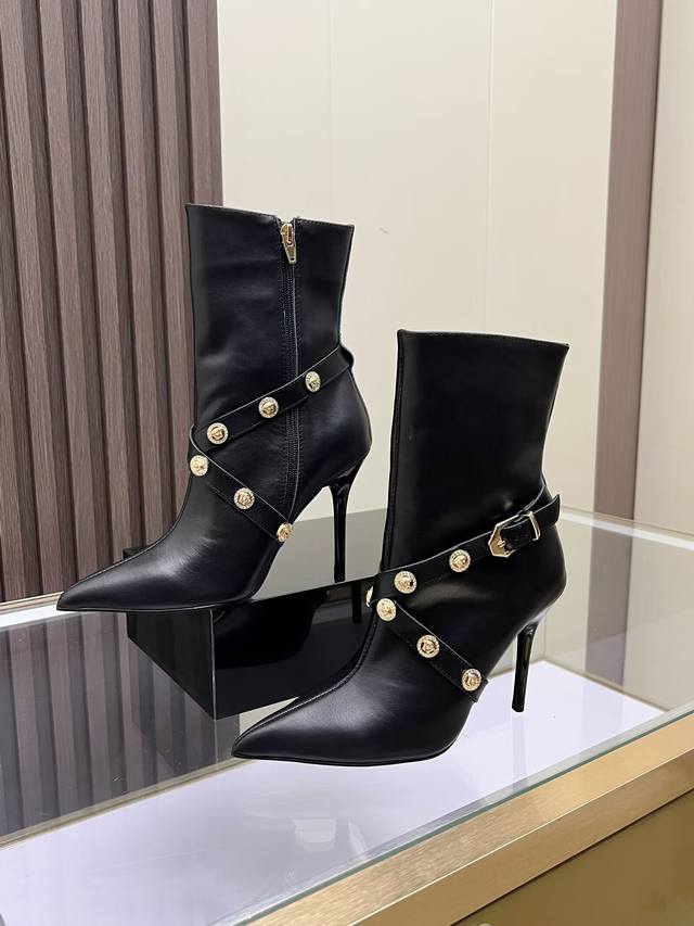范思哲时尚高跟短靴,面料牛皮,内里垫脚全羊皮,橡胶大底,跟高10.5Cm,纤细性感,稳健舒适。