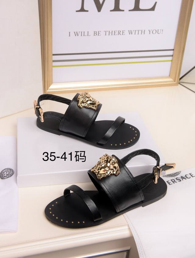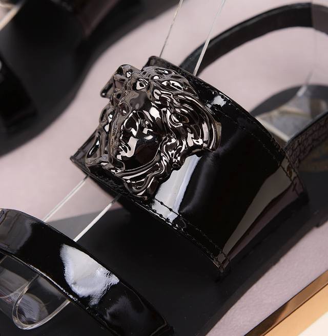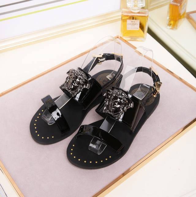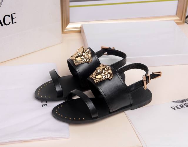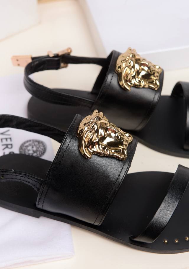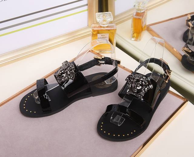 范思哲新款平底凉鞋,面料牛皮 牛漆皮,内里羊皮,优质橡胶中底配永不失流行的金属铆钉,以简洁的造型,精致的细节,无处不彰显着大牌范儿的低调奢华之美,耐磨舒适橡胶大底,着地感平稳,呵护你的双脚,令行走非常方便舒适。